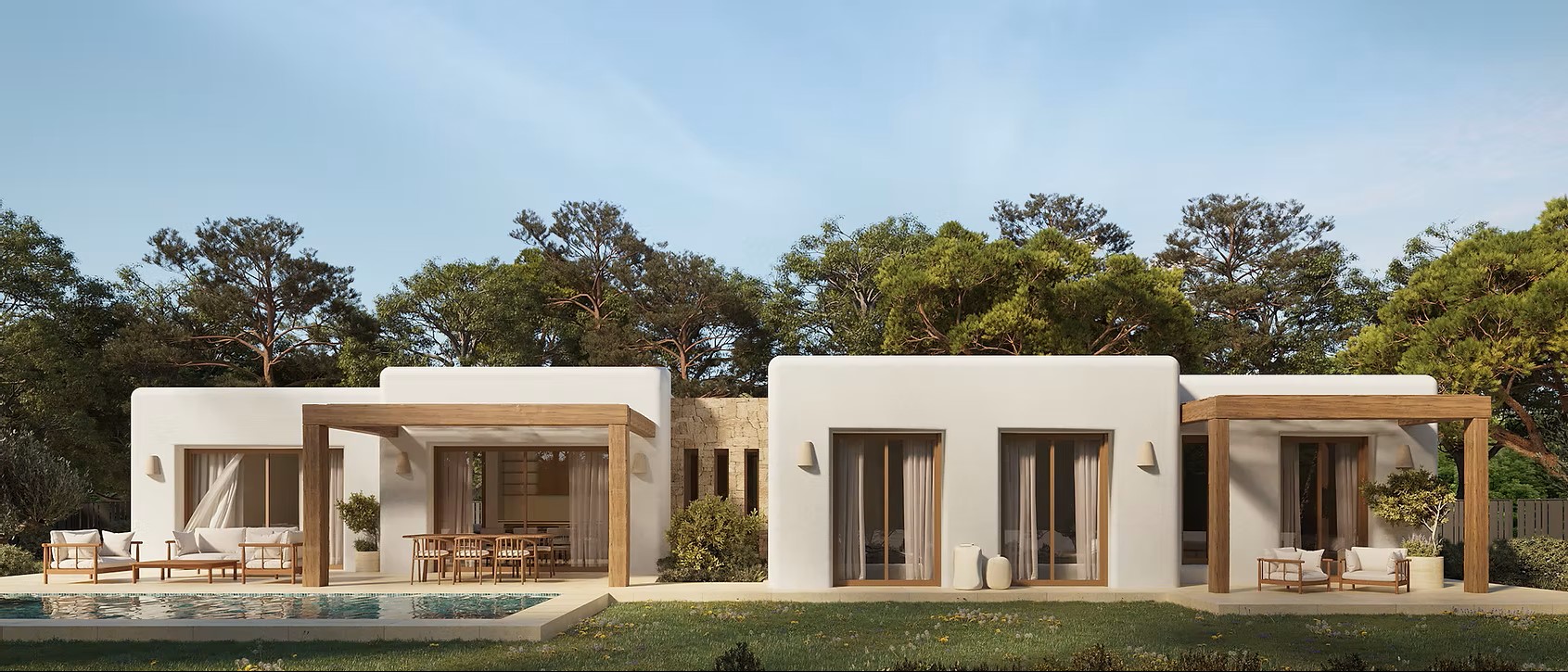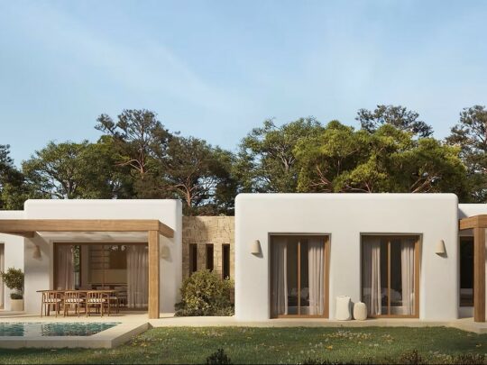 Each villa is single-story, maximizing convenience and integrating indoor and outdoor living spaces effortlessly. Clean lines, cubic volumes, and the use of natural materials such as wood and stone create a warm and timeless atmosphere, while large openings and terraces allow natural light to flood the interiors.