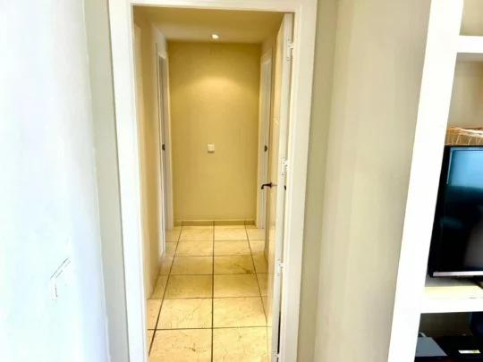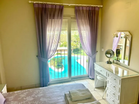 The thoughtfully designed layout includes two spacious double bedrooms accessed via an inner hallway. The master suite features an elegant en-suite bathroom and serene views overlooking the communal pool and landscaped gardens. A second full family bathroom serves the property.